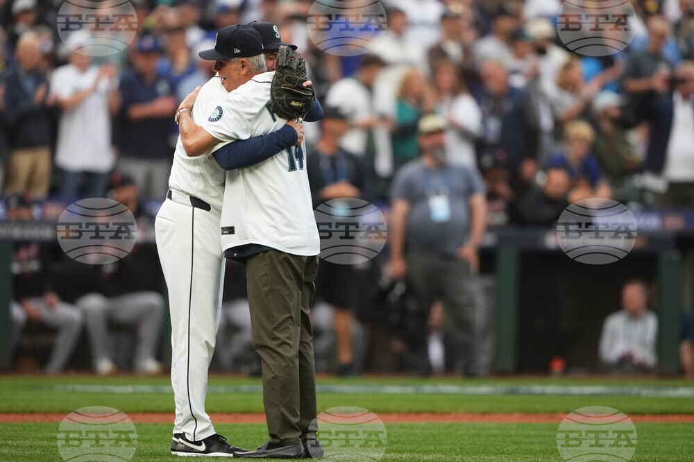 Former Seattle Mariners manager Lou Piniella, right, greets current manager Dan Wilson after throwing out the first pitch of Game 1 of baseball's American League Division Series against the Detroit Tigers, Saturday, Oct. 4, 2025, in Seattle. (AP Photo/Lindsey Wasson)