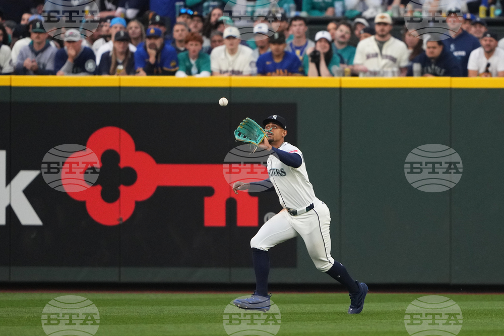 Seattle Mariners center fielder Julio Rodríguez catches a line out by Detroit Tigers' Kerry Carpenter during the third inning in Game 1 of baseball's American League Division Series, Saturday, Oct. 4, 2025, in Seattle. (AP Photo/Lindsey Wasson)