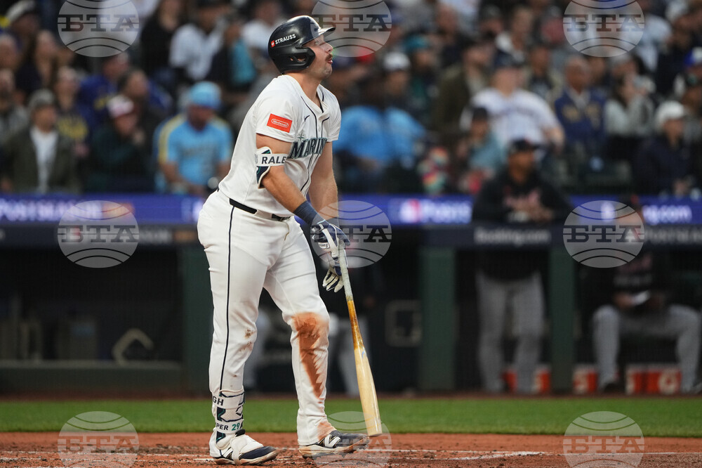 Seattle Mariners' Cal Raleigh hits a single during the first inning in Game 1 of baseball's American League Division Series against the Detroit Tigers, Saturday, Oct. 4, 2025, in Seattle. (AP Photo/John Froschauer)