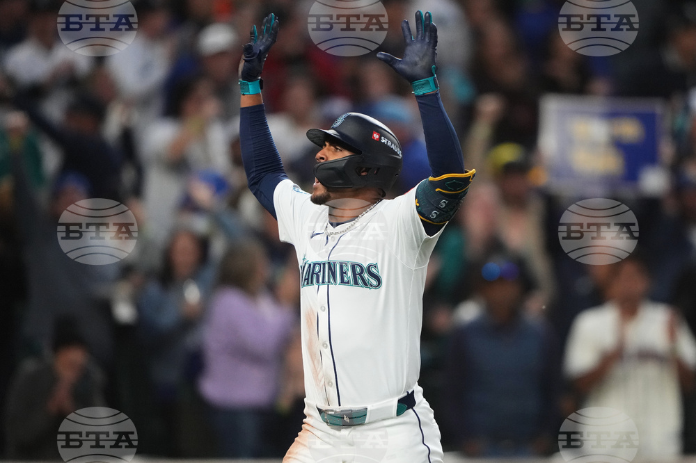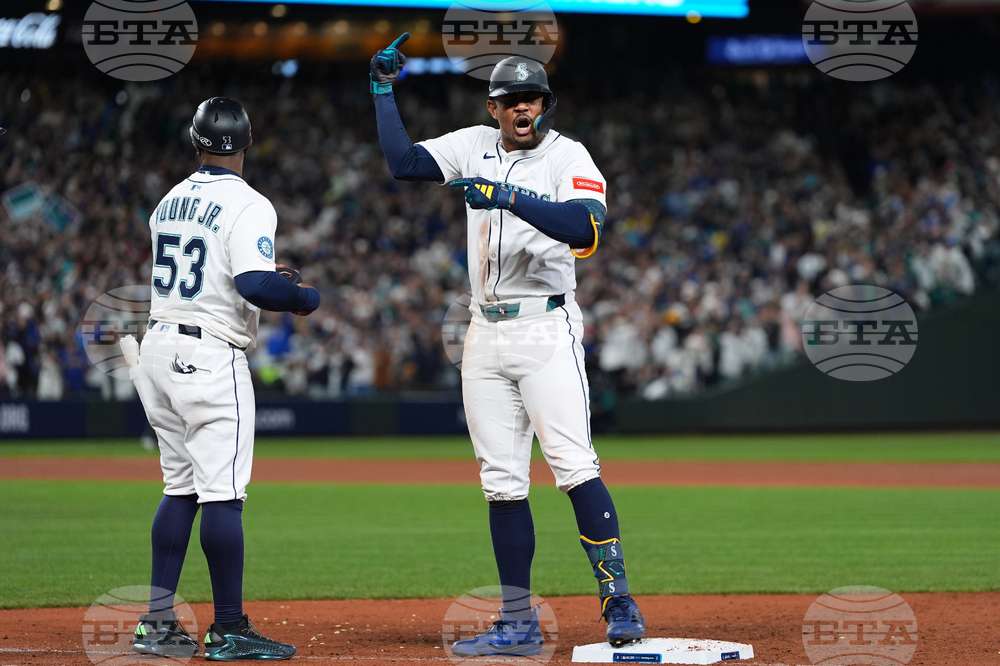 Seattle Mariners' Julio Rodriguez hits a single that scored Randy Arozarena for the tying run during the sixth inning in Game 1 of baseball's American League Division Series against the Detroit Tigers, Saturday, Oct. 4, 2025, in Seattle. (AP Photo/John Froschauer)