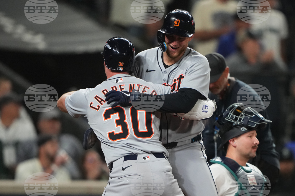 Detroit Tigers' Kerry Carpenter, center, celebrates with manager A.J. Hinch, right, after hitting a two-run home run during the fifth inning in Game 1 of baseball's American League Division Series against the Seattle Mariners, Saturday, Oct. 4, 2025, in Seattle. (AP Photo/Lindsey Wasson)