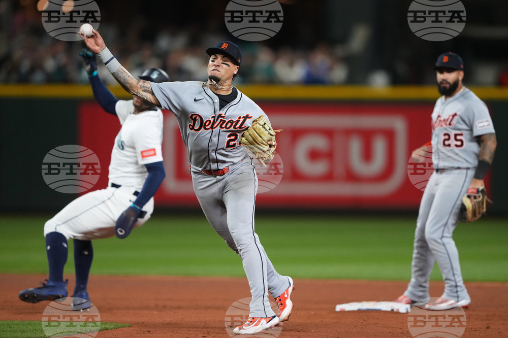 Detroit Tigers center fielder Javier Báez throws out Seattle Mariners' Josh Naylor at first to complete a double play after tagging out Julio Rodriguez during the sixth inning in Game 1 of baseball's American League Division Series, Saturday, Oct. 4, 2025, in Seattle. (AP Photo/Lindsey Wasson)