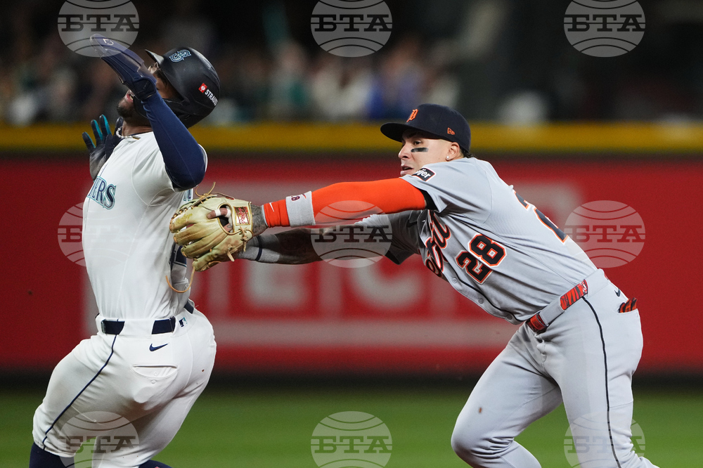 Detroit Tigers center fielder Javier Báez, right, tags out Seattle Mariners' Julio Rodriguez during the sixth inning in Game 1 of baseball's American League Division Series, Saturday, Oct. 4, 2025, in Seattle. (AP Photo/Lindsey Wasson)