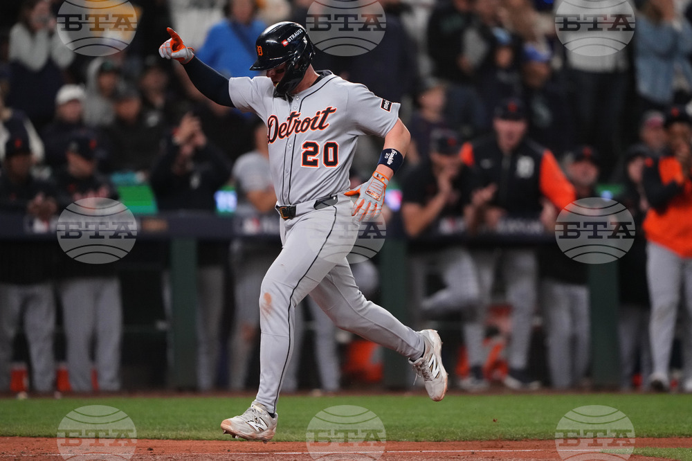 Detroit Tigers' Spencer Torkelson runs home to score the go-ahead run off of a single hit by Zach McKinstry during the 11th inning in Game 1 of baseball's American League Division Series against the Seattle Mariners, Saturday, Oct. 4, 2025, in Seattle. (AP Photo/Lindsey Wasson)