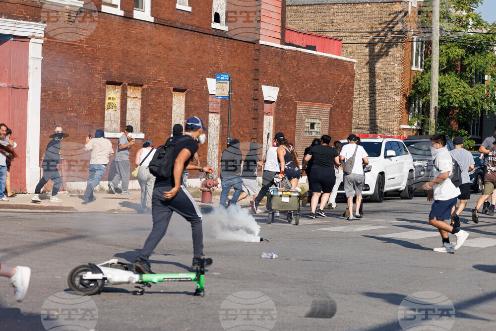 A gas canister erupts on the street in the Brighton Park neighborhood of Chicago, on Saturday, Oct. 4, 2025, after protesters learned that U.S. Border Patrol shot a woman Saturday morning on Chicago's Southwest Side. (Anthony Vazquez/Chicago Sun-Times via AP)