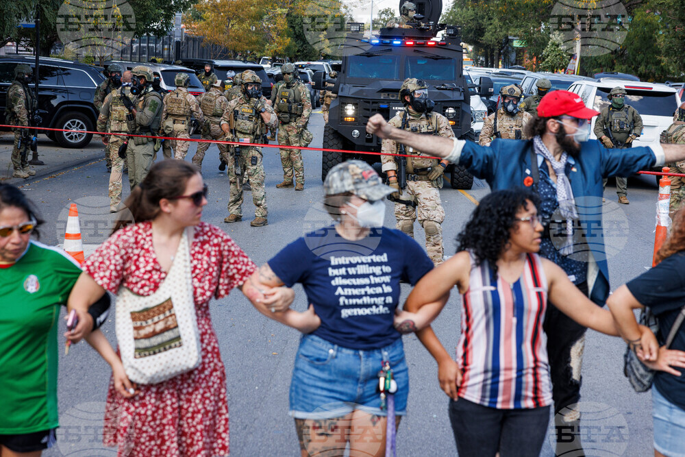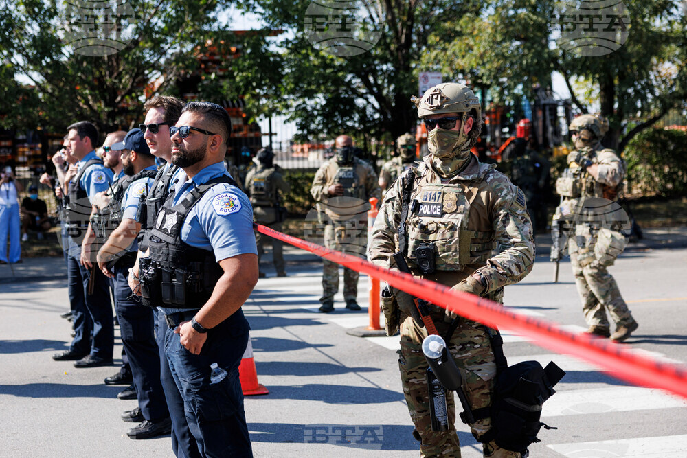 Federal officers stand guard in the Brighton Park neighborhood of Chicago, on Saturday, Oct. 4, 2025, after protesters learned that U.S. Border Patrol shot a woman Saturday morning on Chicago's Southwest Side. (Anthony Vazquez/Chicago Sun-Times via AP)