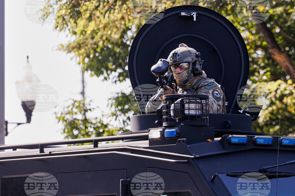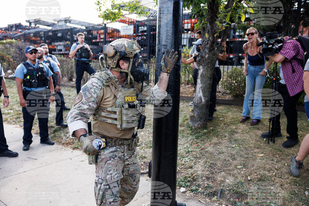 A federal officer stands guard in the Brighton Park neighborhood of Chicago, on Saturday, Oct. 4, 2025, after protesters learned that U.S. Border Patrol shot a woman Saturday morning on Chicago's Southwest Side. (Anthony Vazquez/Chicago Sun-Times via AP)
