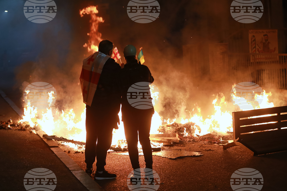 Demonstrators with a Georgian and Ukrainian national flags stand behind a burning barricade not far from a police line during an opposition rally in the city center of Tbilisi, Georgia, on Saturday, Oct. 4, 2025, boycotting the municipal elections and calling for the release of political opponents. (AP Photo/Zurab Tsertsvadze)