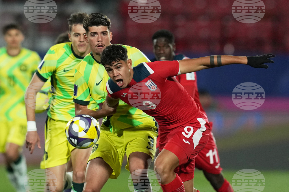 Cuba's Alessio Raballo (9) is challenged by Australia's Sebastian Esposito during a FIFA U-20 World Cup Group D soccer match at National Stadium in Santiago, Chile, Saturday, Oct. 4, 2025. (AP Photo/Esteban Felix)