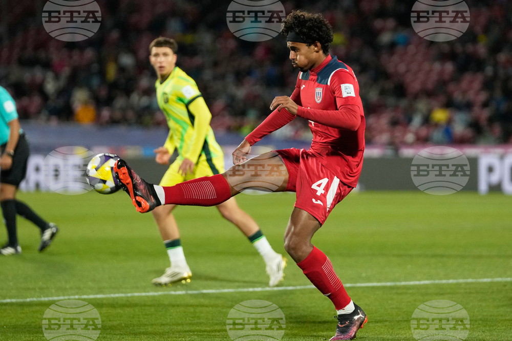 Cuba's Camilo Pinillo tries control the ball during a FIFA U-20 World Cup Group D soccer match against Australia at National Stadium in Santiago, Chile, Saturday, Oct. 4, 2025. (AP Photo/Matias Delacroix)