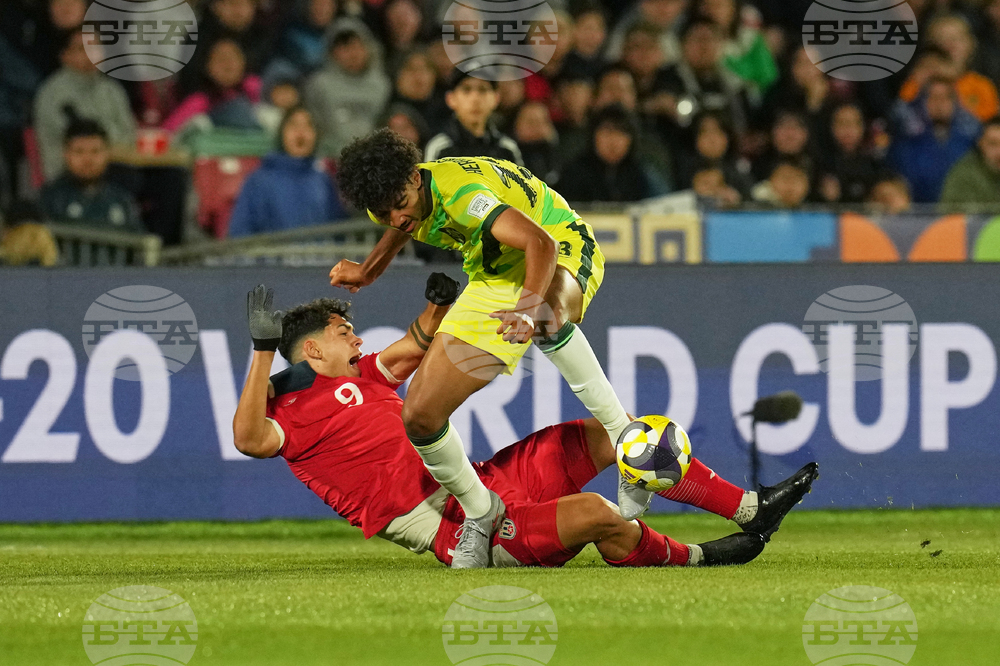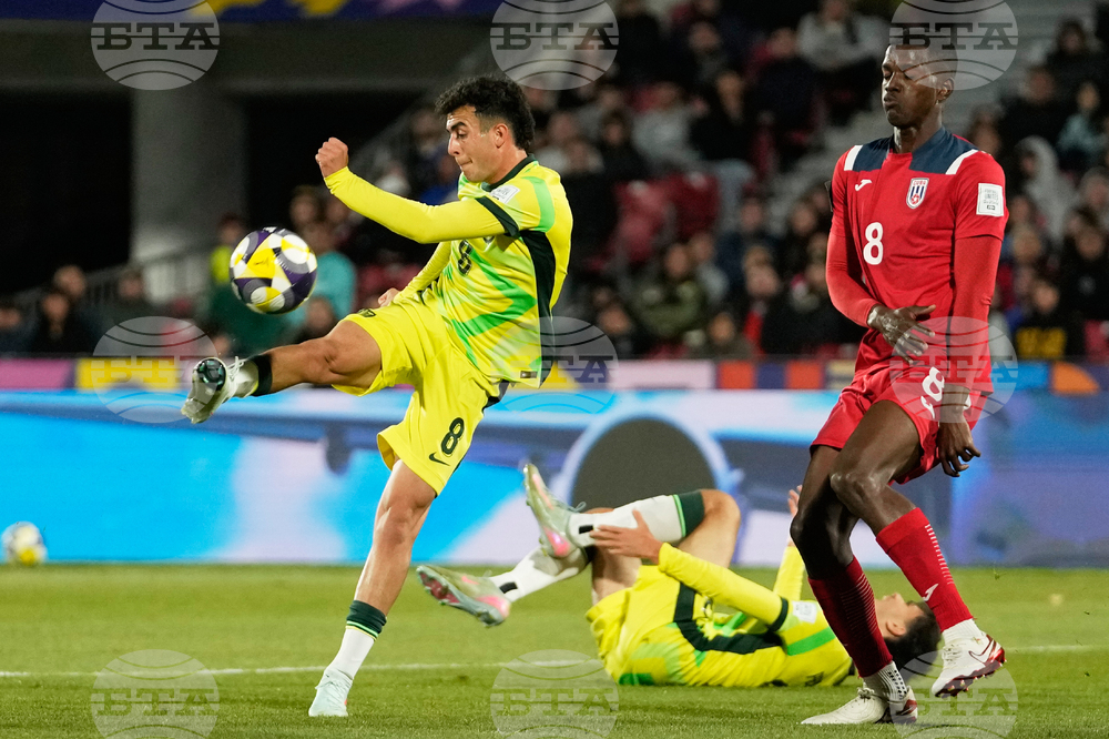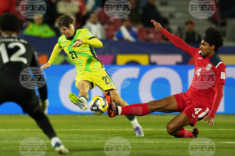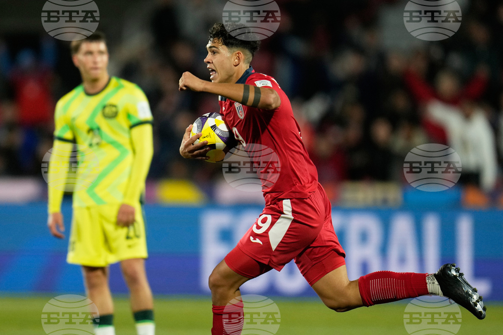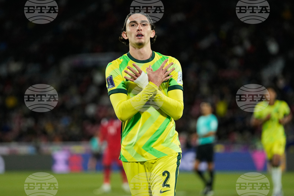 Australia's Daniel Bennie celebrates scoring his side's 2nd goal against Cuba during a FIFA U-20 World Cup Group D soccer match at National Stadium in Santiago, Chile, Saturday, Oct. 4, 2025. (AP Photo/Matias Delacroix)