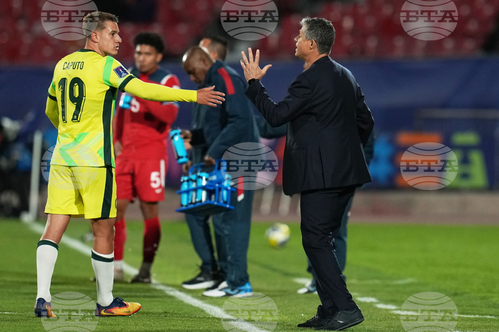 Australia's coach Trevor Morgan gestures during a FIFA U-20 World Cup Group D soccer match against Cuba at National Stadium in Santiago, Chile, Saturday, Oct. 4, 2025. (AP Photo/Matias Delacroix)
