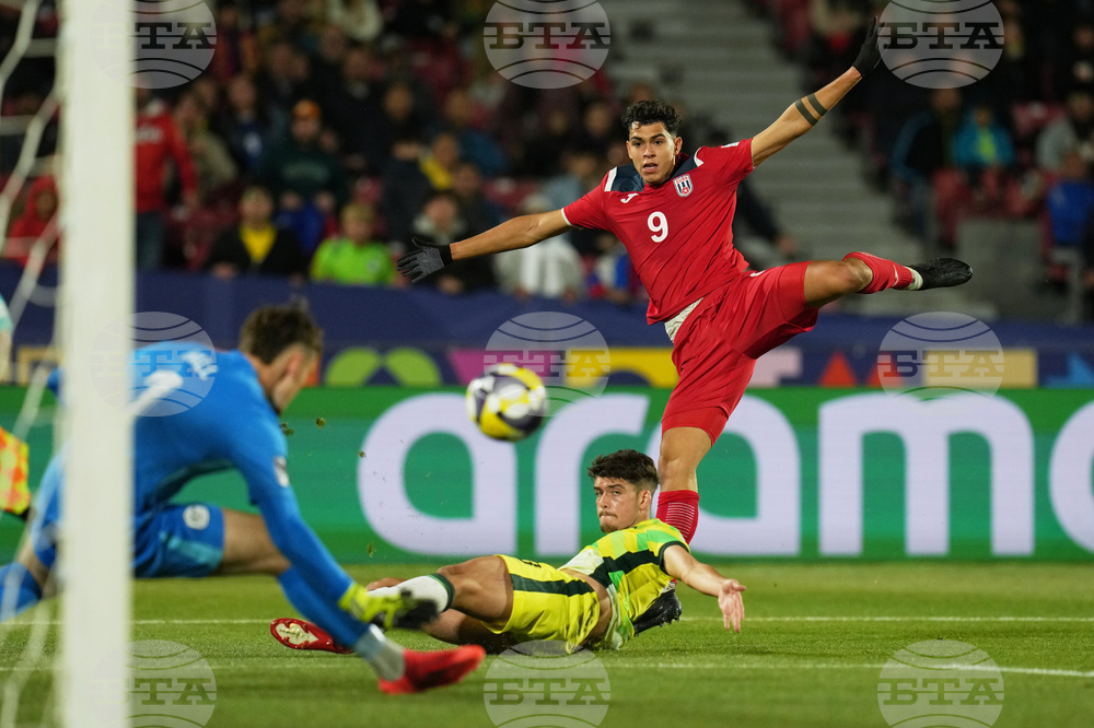 Australia's Daniel Bennie, left, scores his side's 2nd goal in front of Cuba's goalkeeper Yurdy Hodelin during a FIFA U-20 World Cup Group D soccer match at National Stadium in Santiago, Chile, Saturday, Oct. 4, 2025. (AP Photo/Matias Delacroix)