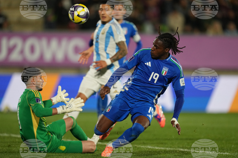Italy's Alvin Okoro, right, and Argentina's goalkeeper Santino Barbi fight for the ball during a FIFA U-20 World Cup Group D soccer match at Elias Figuero Brander in Valparaiso, Chile, Saturday, Oct. 4, 2025. (AP Photo/Andre Penner)