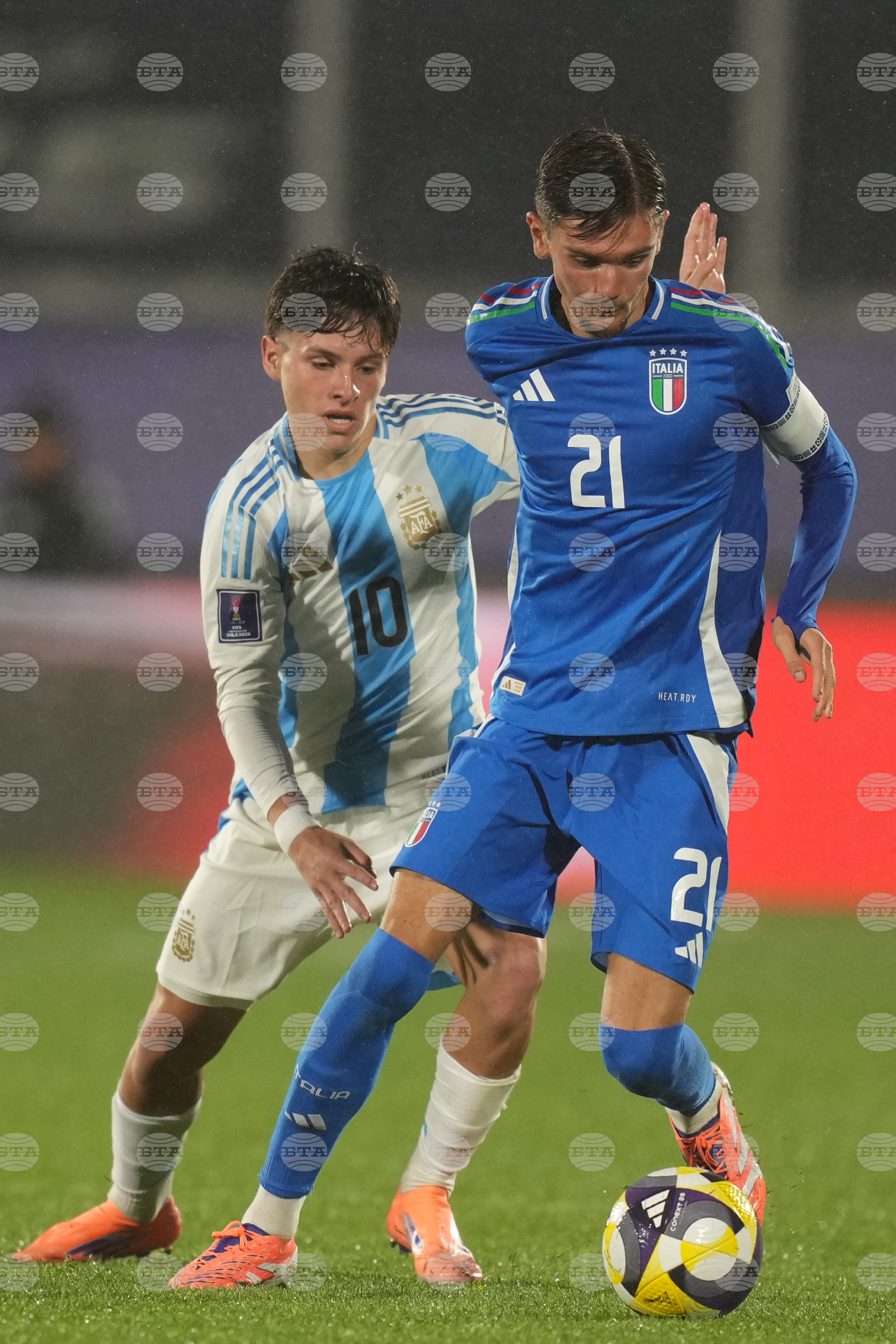 Argentina's Santino Andino, right, and Italy's Francesco Verde battle for the ball during a FIFA U-20 World Cup Group D soccer match at Elias Figuero Brander in Valparaiso, Chile, Saturday, Oct. 4, 2025. (AP Photo/Andre Penner)
