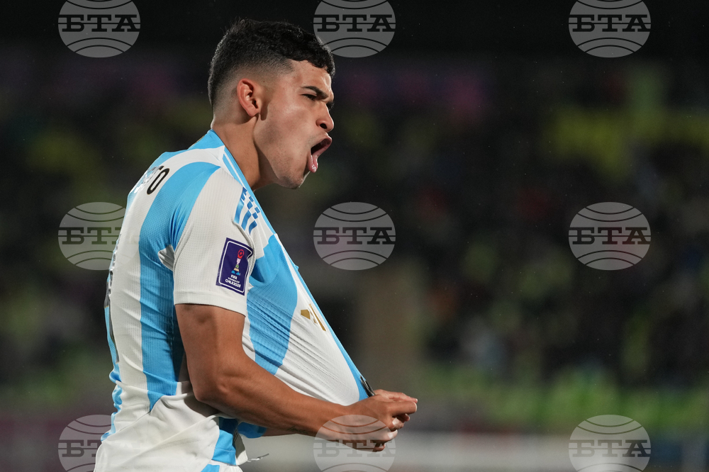 Argentina's Dylan Gorosito celebrates after scoring the opening goal against Italy during a FIFA U-20 World Cup Group D soccer match at Elias Figuero Brander in Valparaiso, Chile, Saturday, Oct. 4, 2025. (AP Photo/Andre Penner)