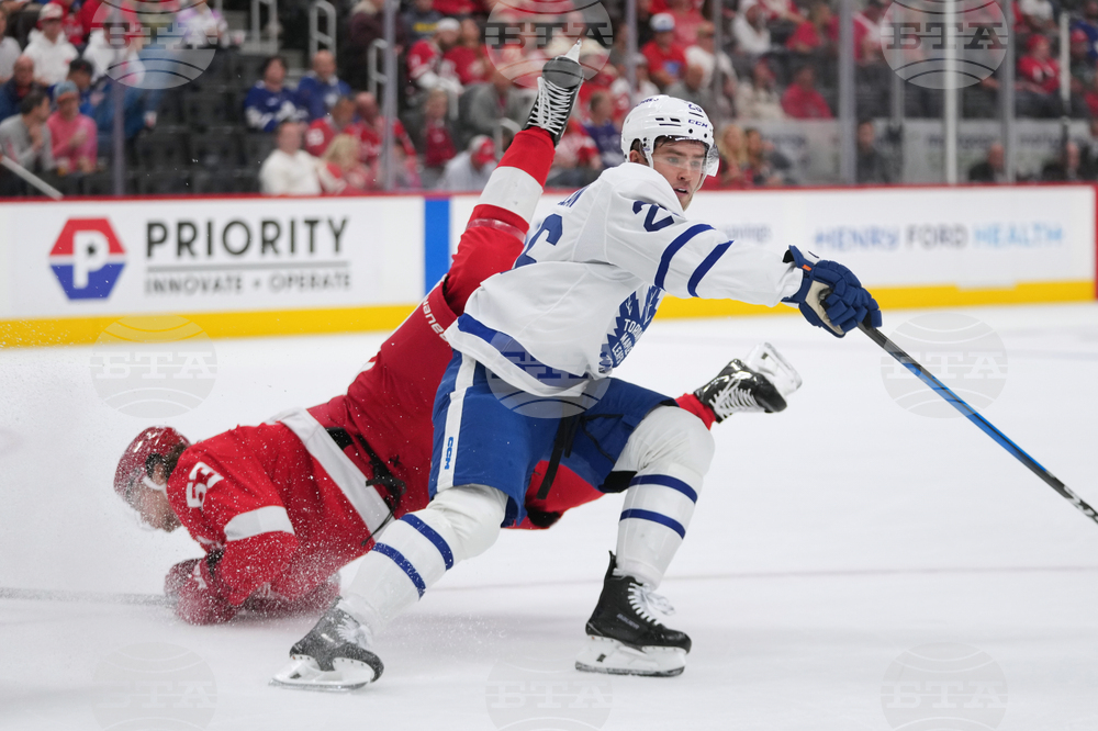 Toronto Maple Leafs' Jacob Quillan (26) checks Detroit Red Wings defenseman Moritz Seider (53) to the ice in the first period of a preseason NHL hockey game Saturday, Oct. 4, 2025, in Detroit. (AP Photo/Paul Sancya)
