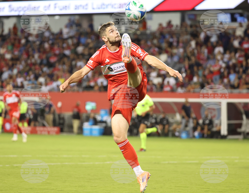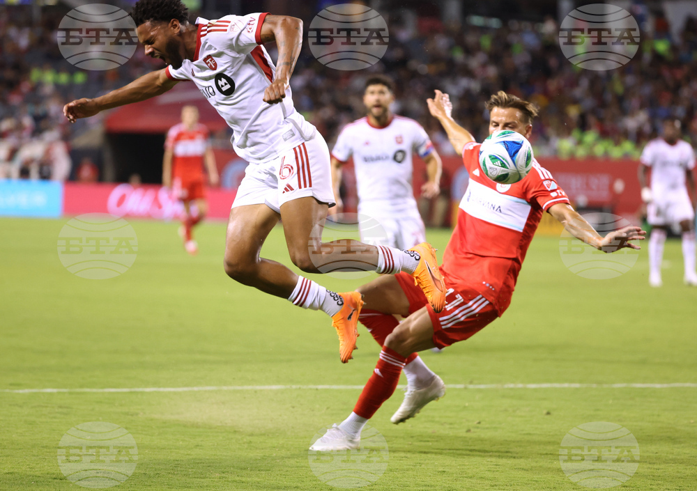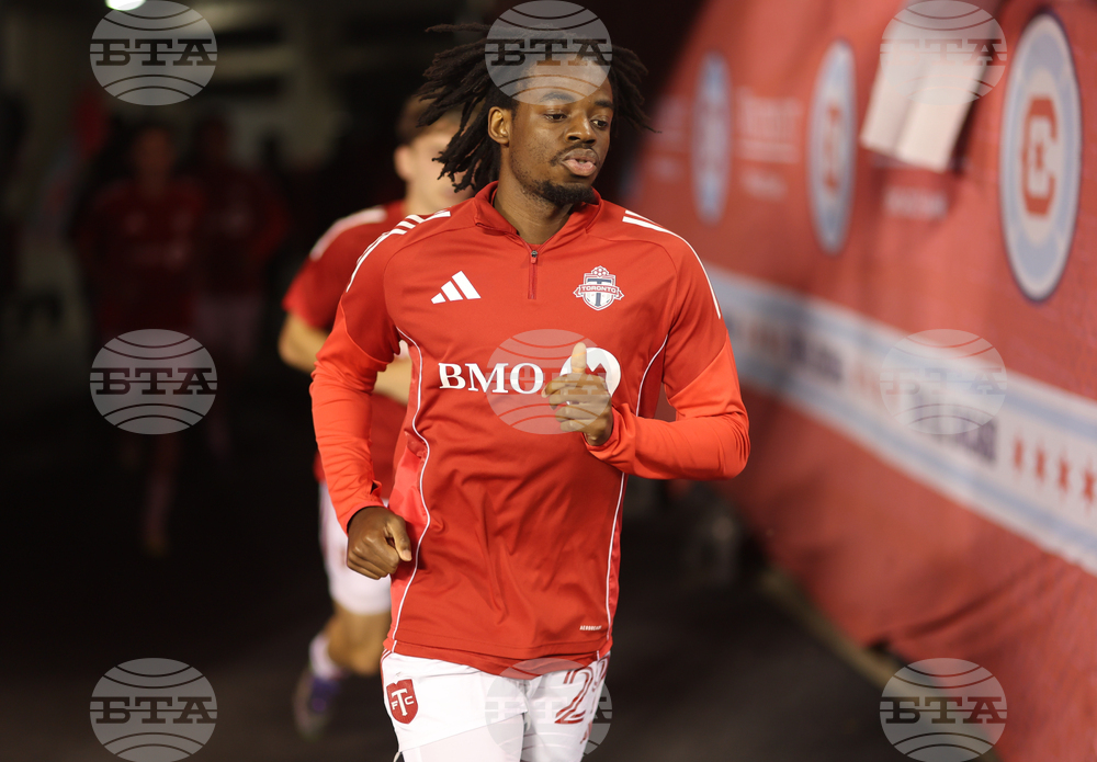 Toronto FC forward Deandre Kerr, top left, heads the ball during the first half of an MLS soccer match against the Chicago Fire, Saturday, Oct. 4, 2025, in Chicago. (AP Photo/Talia Sprague)