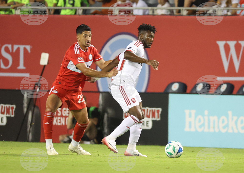 Chicago Fire midfielder Philip Zinckernagel, left, and Toronto FC forward Derrick Etienne Jr., right, battle for control of the ball during the first half of an MLS soccer match Saturday, Oct. 4, 2025, in Chicago. (AP Photo/Talia Sprague)