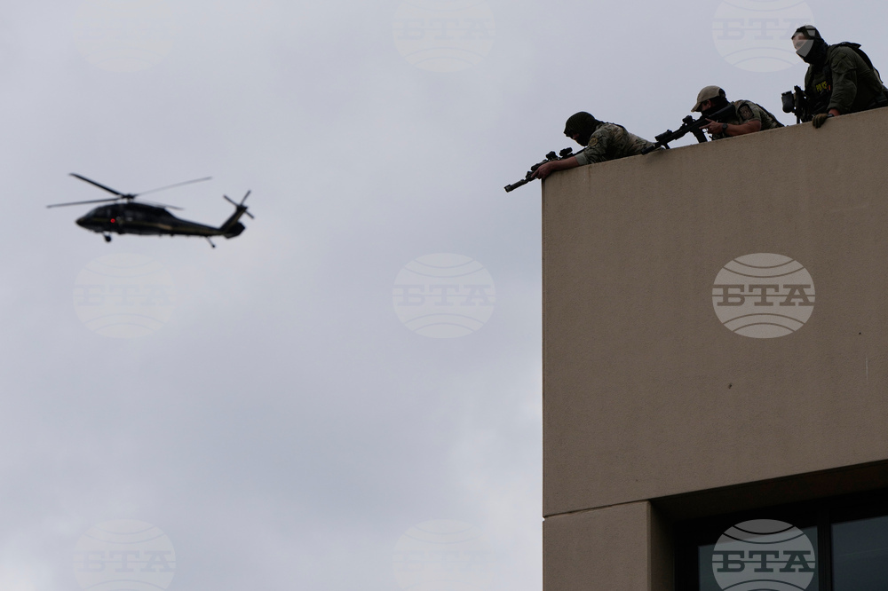 Law enforcement agents aim their weapons from the roof of a U.S. Immigration and Customs Enforcement facility as a helicopter flies past during a protest on Saturday, Oct. 4, 2025, in Portland, Ore. (AP Photo/Jenny Kane)