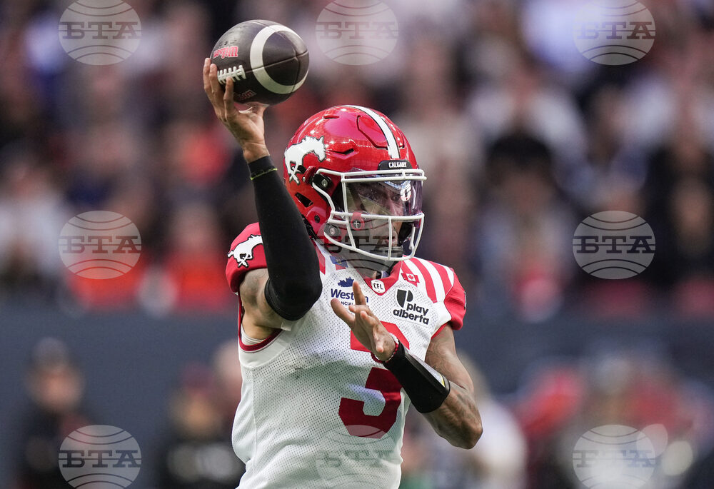 Calgary Stampeders quarterback Vernon Adams Jr. passes during the first half of a CFL football game against the B.C. Lions, in Vancouver, Saturday, Oct. 4, 2025. (Darryl Dyck/The Canadian Press via AP)