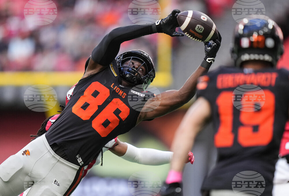 B.C. Lions' Jevon Cottoy (86) makes a reception during the first half of a CFL football game against the Calgary Stampeders, in Vancouver, Saturday, Oct. 4, 2025. (Darryl Dyck/The Canadian Press via AP)