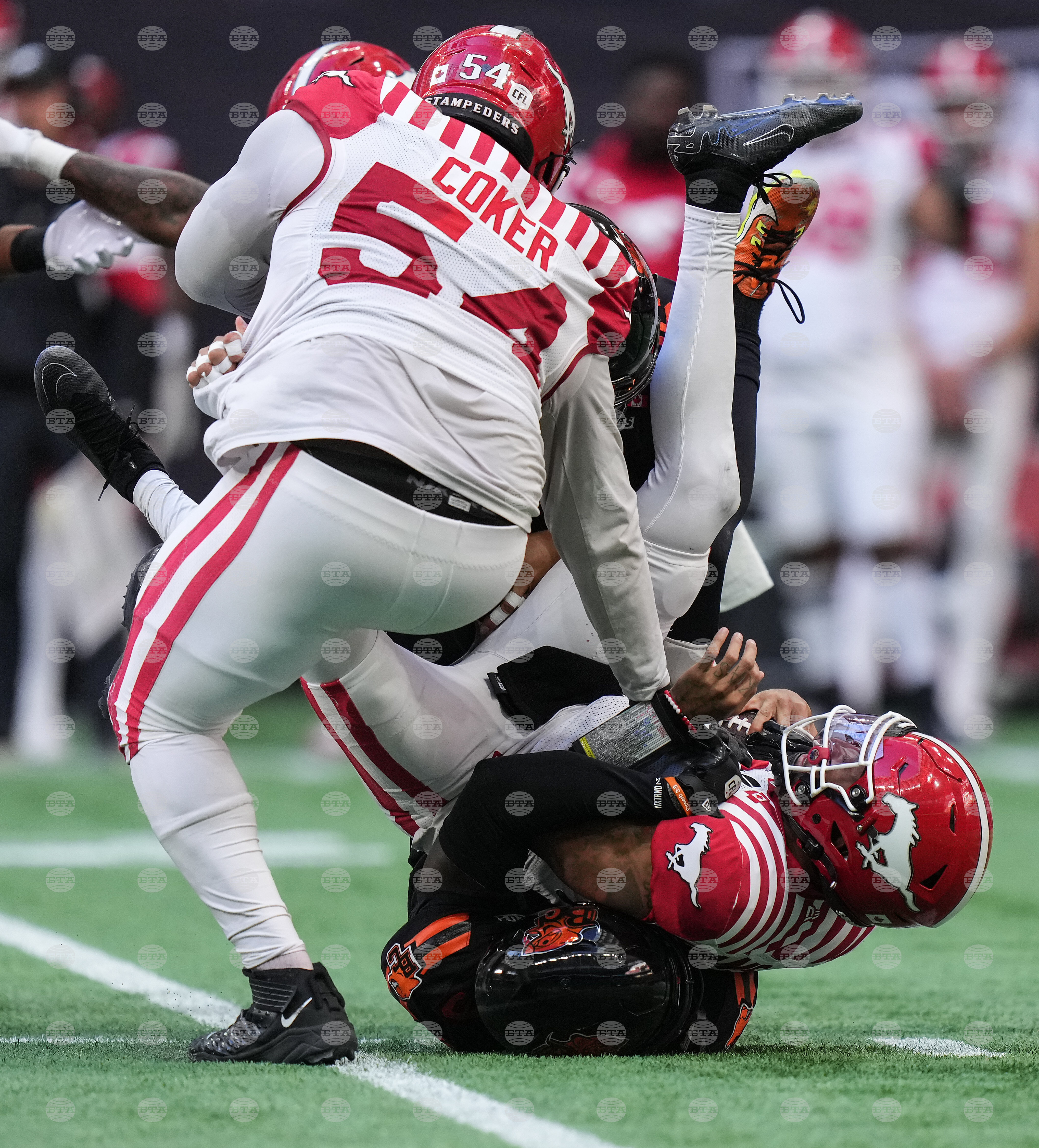 Calgary Stampeders quarterback Vernon Adams Jr., front right, is sacked by B.C. Lions' Deontai Williams during the first half of a CFL football game, in Vancouver, Saturday, Oct. 4, 2025. (Darryl Dyck/The Canadian Press via AP)