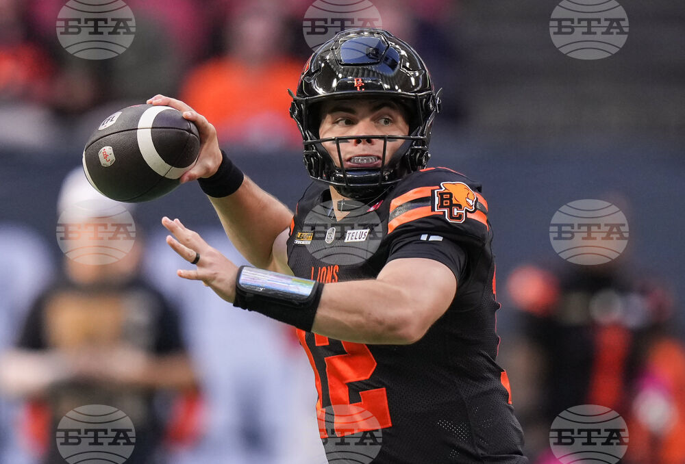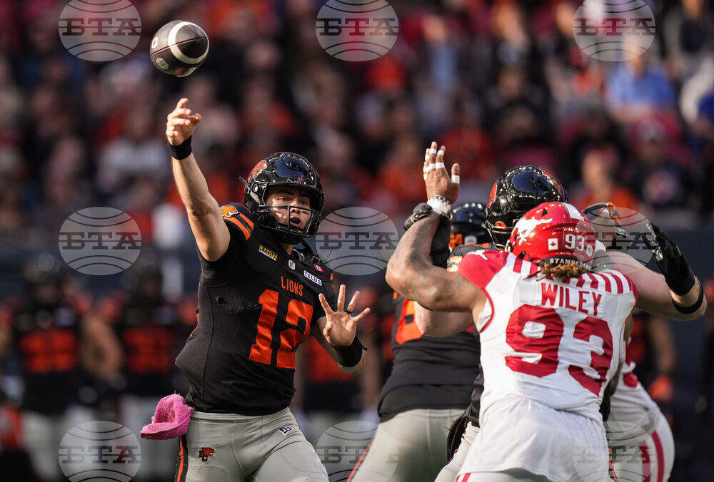 B.C. Lions quarterback Nathan Rourke passes during the first half of a CFL football game against the Calgary Stampeders, in Vancouver, on Saturday, October 4, 2025. (Darryl Dyck/The Canadian Press via AP)