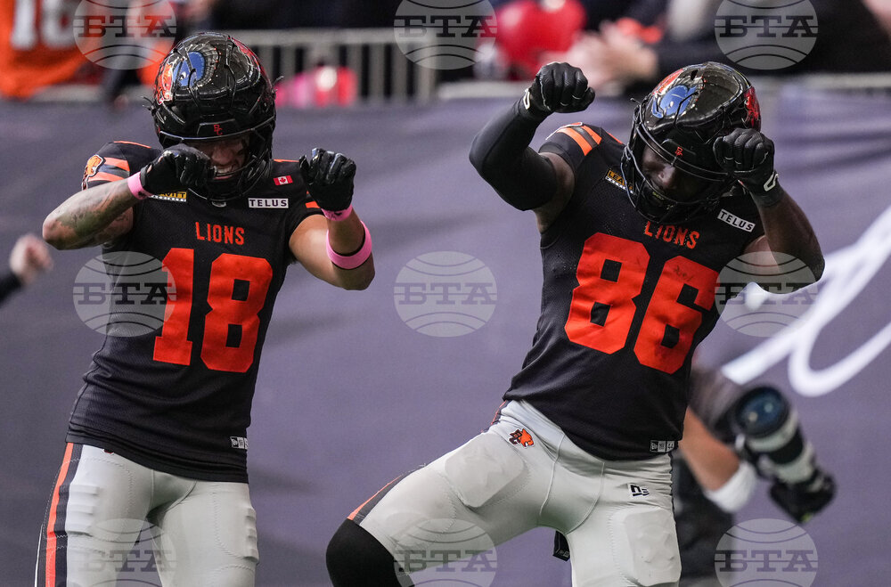 B.C. Lions' Jevon Cottoy (86) and Justin McInnis (18) celebrate Cottoy's touchdown against the Calgary Stampeders during the first half of a CFL football game, in Vancouver, Saturday, Oct. 4, 2025. (Darryl Dyck/The Canadian Press via AP)