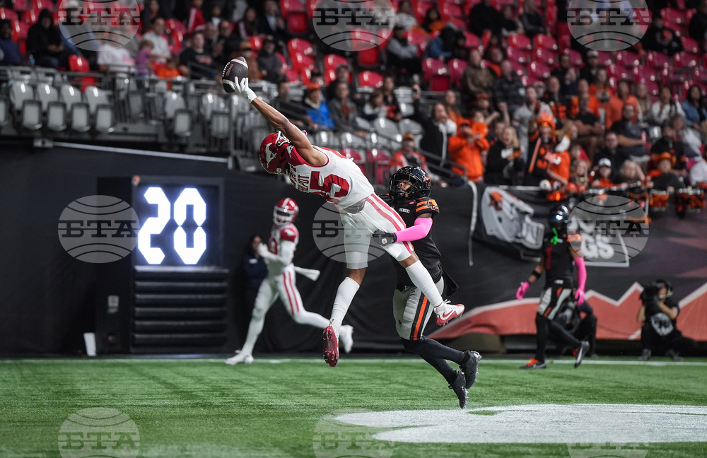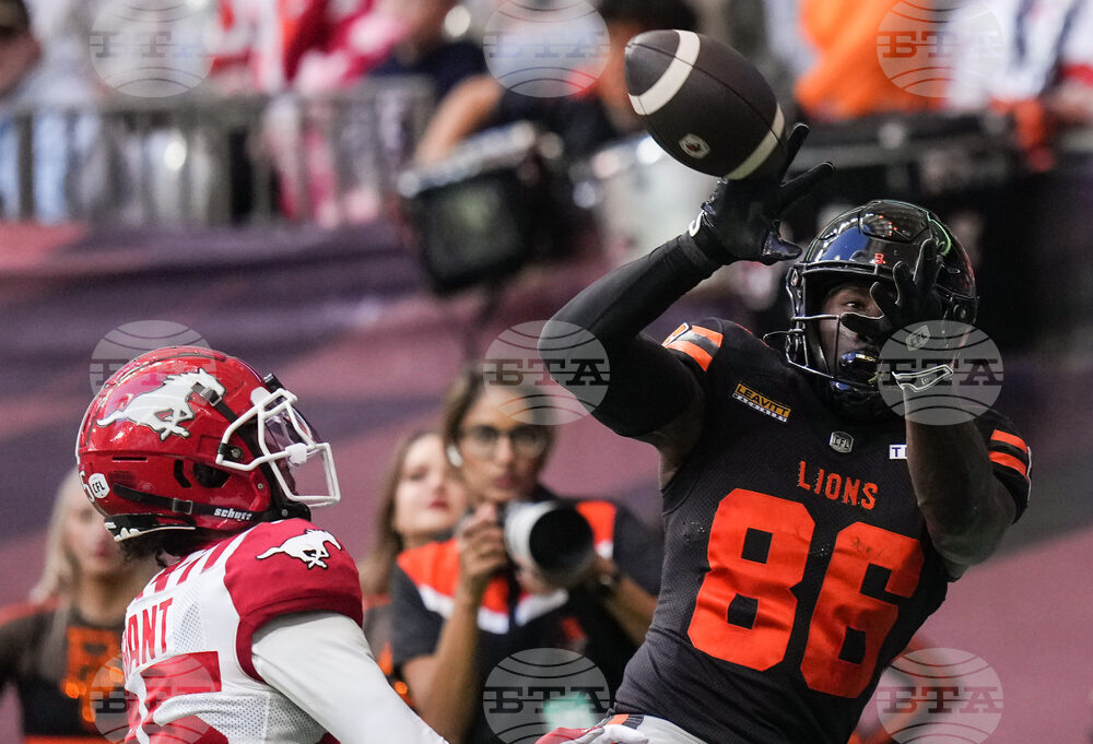 B.C. Lions' Jevon Cottoy makes a reception during the first half of a CFL football game against the Calgary Stampeders, in Vancouver, Saturday, Oct. 4, 2025. (Darryl Dyck/The Canadian Press via AP)
