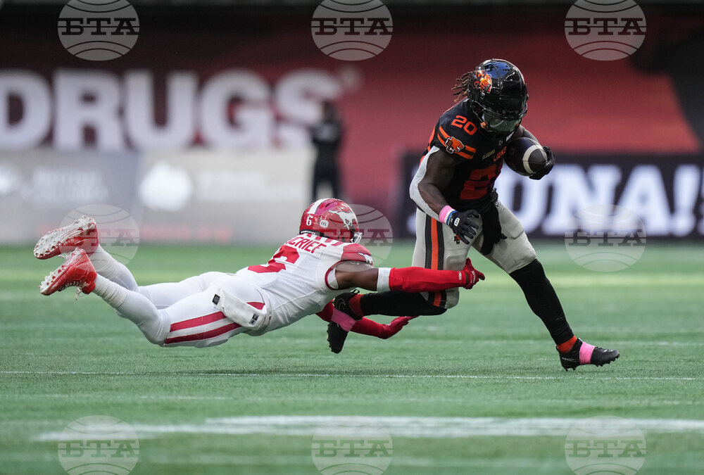 B.C. Lions' James Butler (20) runs the ball past Calgary Stampeders' Derrick Moncrief (6) during the first half of a CFL football game, in Vancouver, Saturday, Oct. 4, 2025. (Darryl Dyck/The Canadian Press via AP)