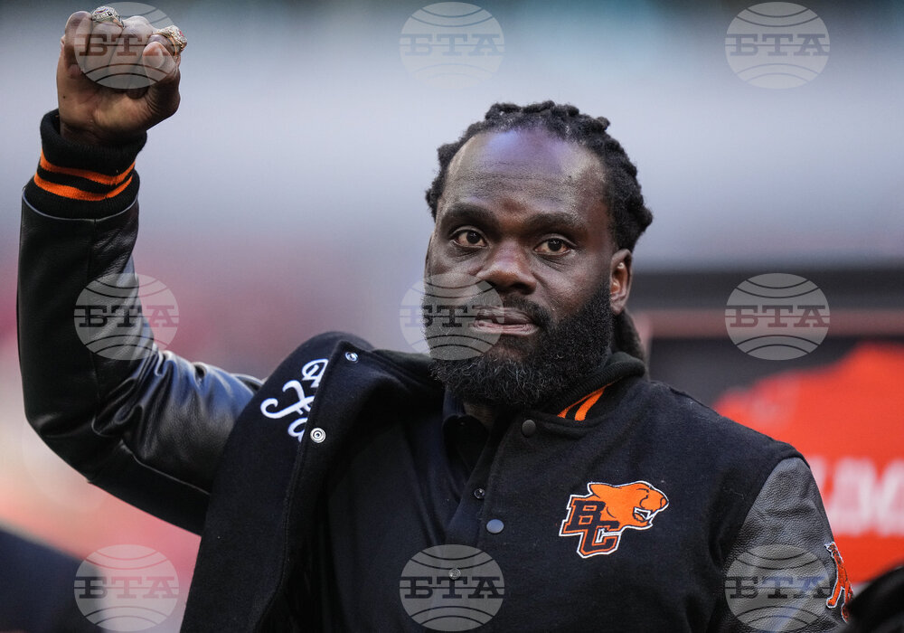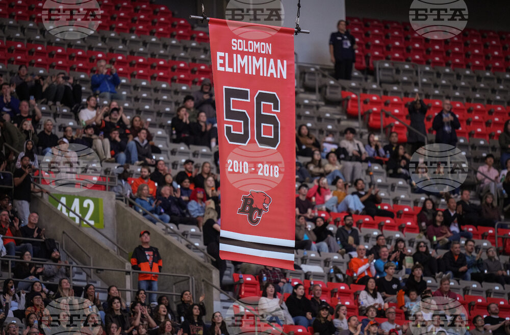 Former B.C. Lions linebacker Solomon Elimimian's number 56 is retired during halftime of the B.C. Lions and Calgary Stampeders CFL football game, in Vancouver, Saturday, Oct. 4, 2025. (Darryl Dyck/The Canadian Press via AP)