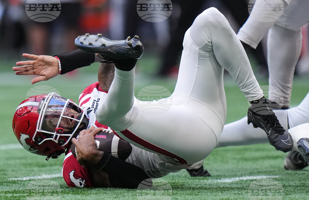 Calgary Stampeders quarterback Vernon Adams Jr. falls after being sacked by B.C. Lions' Deontai Williams, not seen, during the first half of a CFL football game, in Vancouver, on Saturday, October 4, 2025. (Darryl Dyck/The Canadian Press via AP)