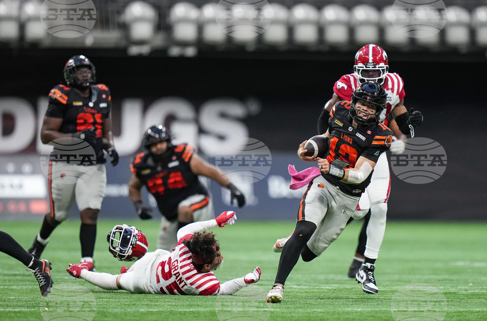 B.C. Lions quarterback Nathan Rourke, front left, is sacked by Calgary Stampeders' Clarence Hicks during the first half of a CFL football game, in Vancouver, on Saturday, October 4, 2025. (Darryl Dyck/The Canadian Press via AP)
