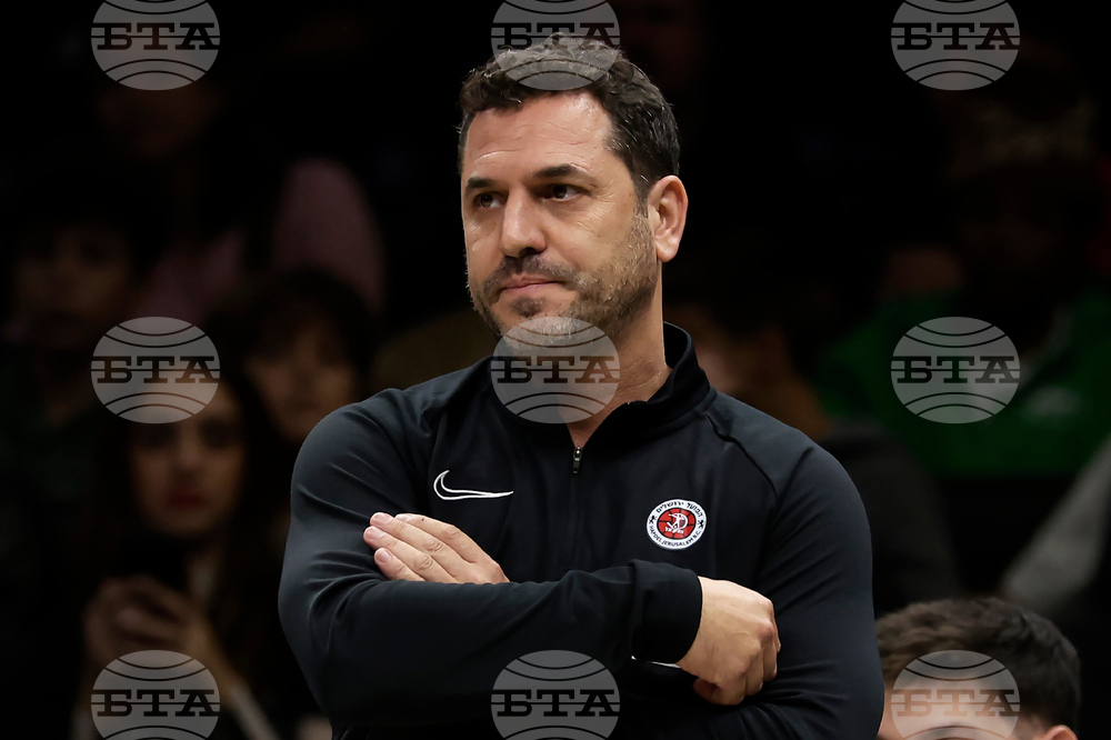 Hapoel Jerusalem head coach Yonatan Alon reacts during the first half of a preseason NBA basketball game against the Brooklyn Nets, Saturday, Oct. 4, 2025, in New York. (AP Photo/Adam Hunger)