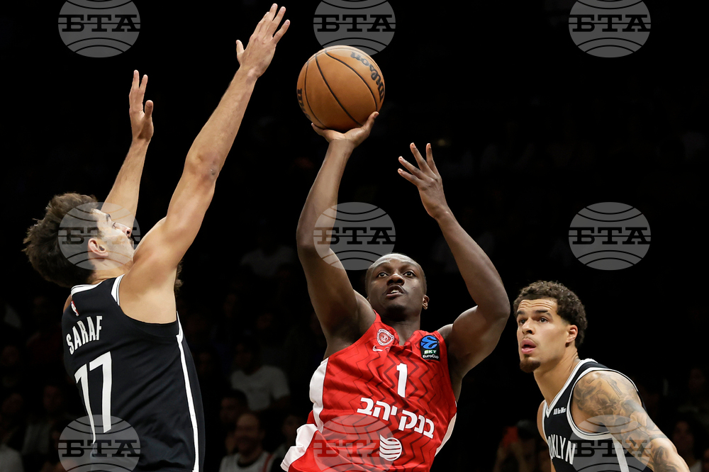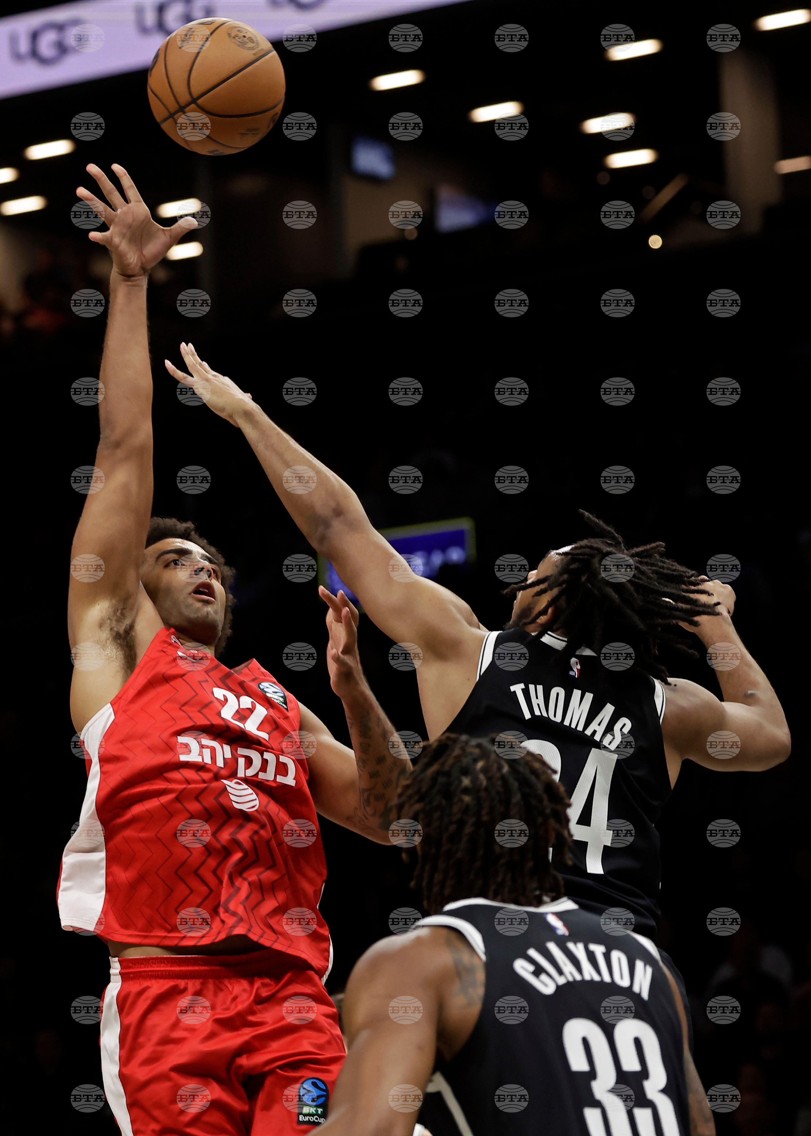 Hapoel Jerusalem forward Anthony Lamb (22) shoots over Brooklyn Nets guard Cam Thomas, top right, during the first half of a preseason NBA basketball game Saturday, Oct. 4, 2025, in New York. (AP Photo/Adam Hunger)