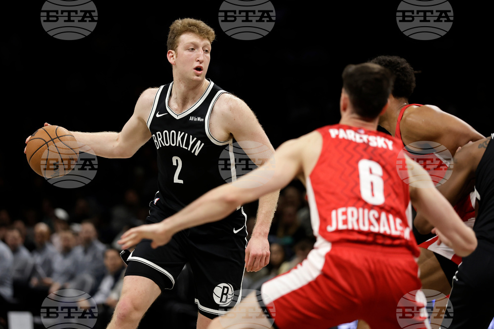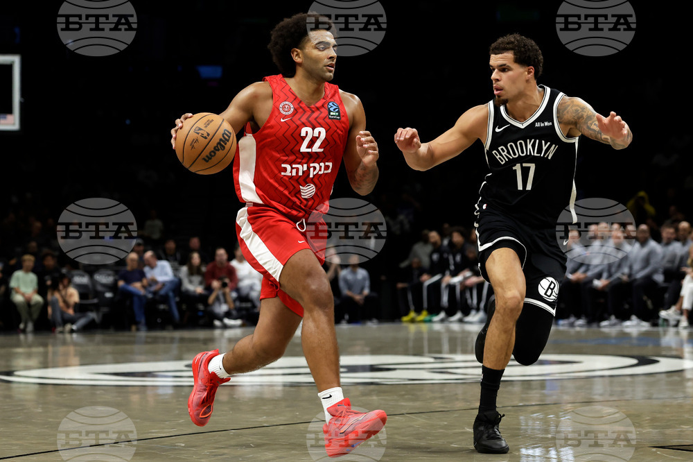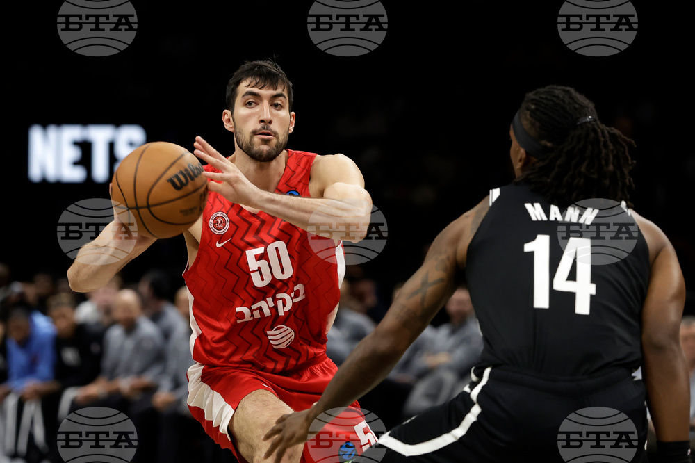 Hapoel Jerusalem forward Yovel Zoosman (50) passes around Brooklyn Nets guard/forward Terance Mann (14) during the first half of a preseason NBA basketball game Saturday, Oct. 4, 2025, in New York. (AP Photo/Adam Hunger)