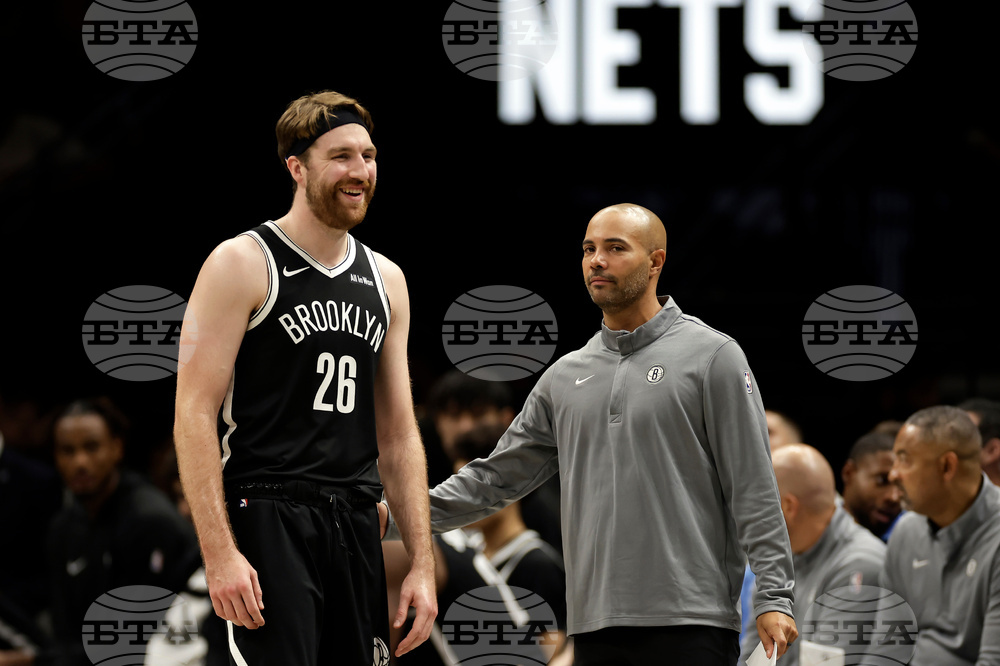 Brooklyn Nets head coach Jordi Fernandez, center right, talks to Drew Timme (26) during the second half of a preseason NBA basketball game against Hapoel Jerusalem, Saturday, Oct. 4, 2025, in New York. (AP Photo/Adam Hunger)