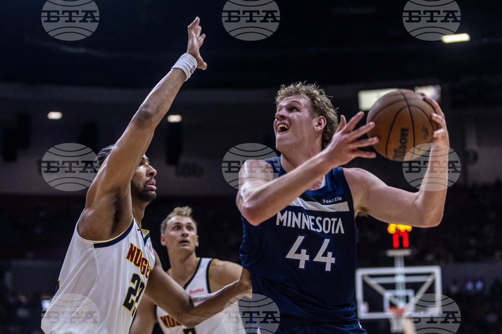 Denver Nuggets center Jonas Valanciunas, left, defends against Minnesota Timberwolves center Rocco Zikarsky (44) during the second half of a preseason NBA basketball game Saturday, Oct. 4, 2025, in San Diego. (AP Photo/Tony Ding)