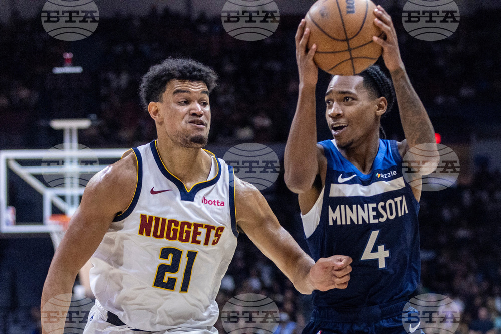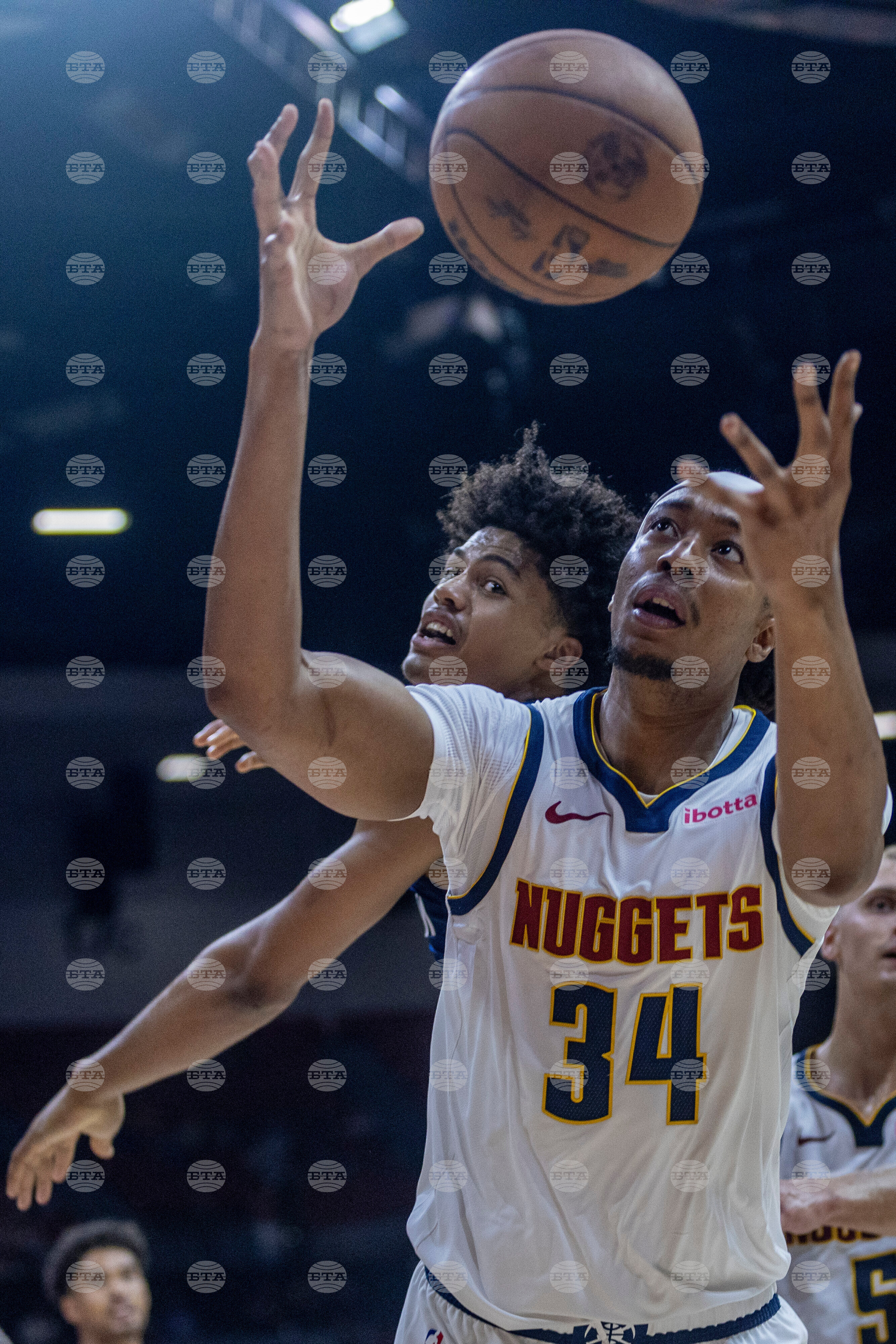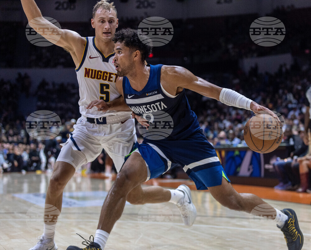 Minnesota Timberwolves' Joan Beringer, left back, loses a rebound to Denver Nuggets' Moses Brown (34) during the second half of a preseason NBA basketball game Saturday, Oct. 4, 2025, in San Diego. (AP Photo/Tony Ding)