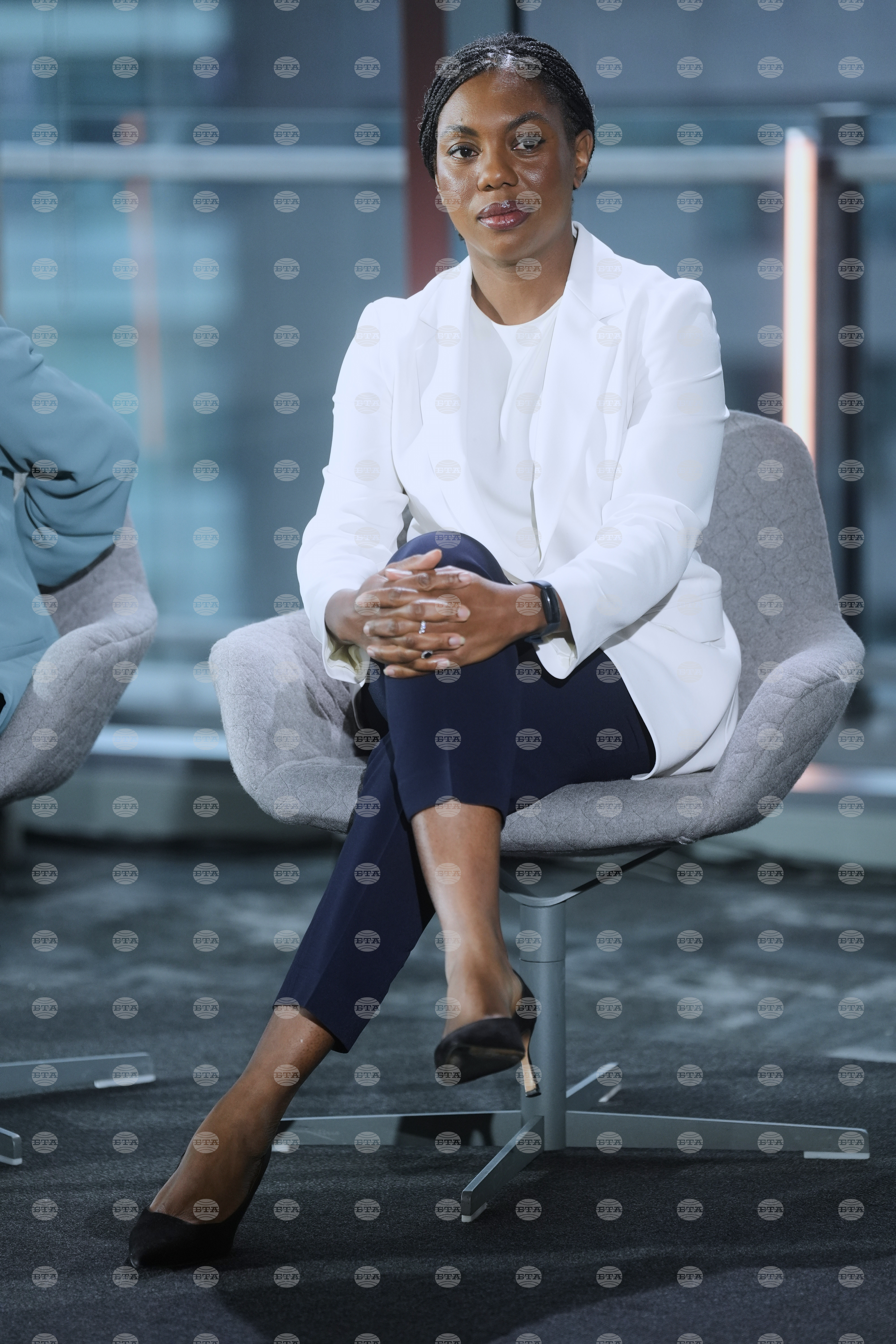 Britain's Conservative Party leader Kemi Badenoch speaks during an appearance on the BBC One current affairs programme, Sunday with Laura Kuenssberg at Media City, in Salford, England, Sunday, Oct. 5, 2025. (Danny Lawson/Pool Photo via AP)