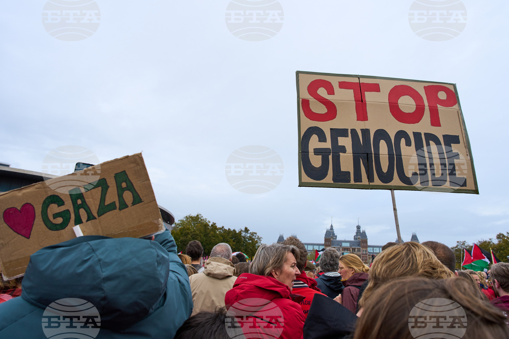 Two people with signs reading "Stop the Genocide in Gaza" join tens of thousands of protesters who march demanding their government do more to halt Israel's campaign in Gaza, during a demonstration in Amsterdam, Netherlands, Sunday, Oct. 5, 2025. (AP Photo/Peter Dejong)