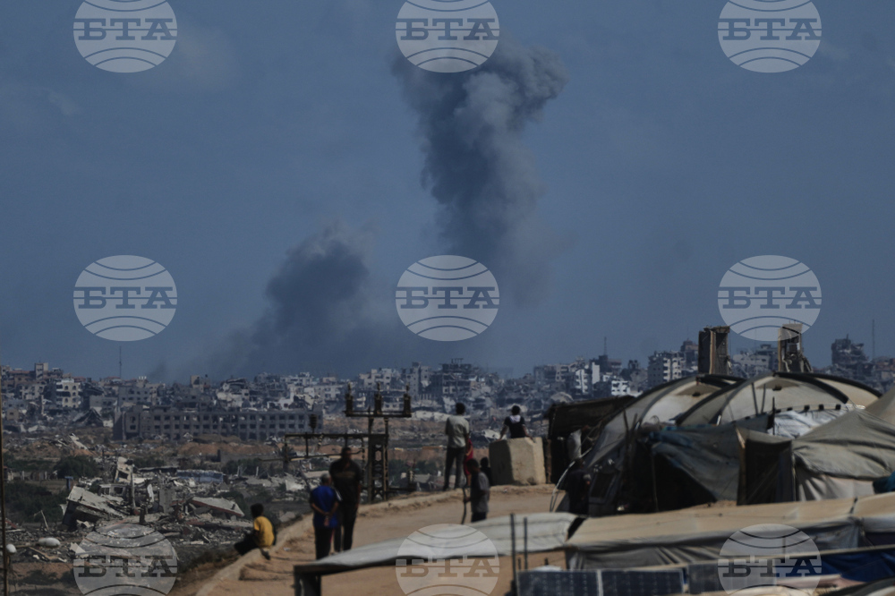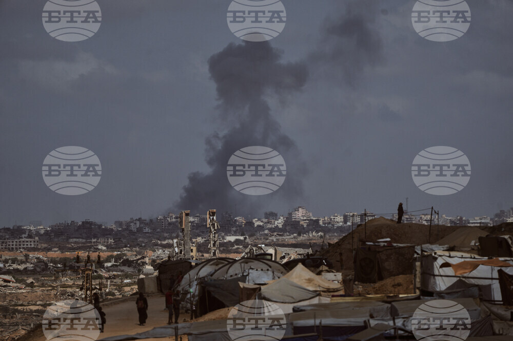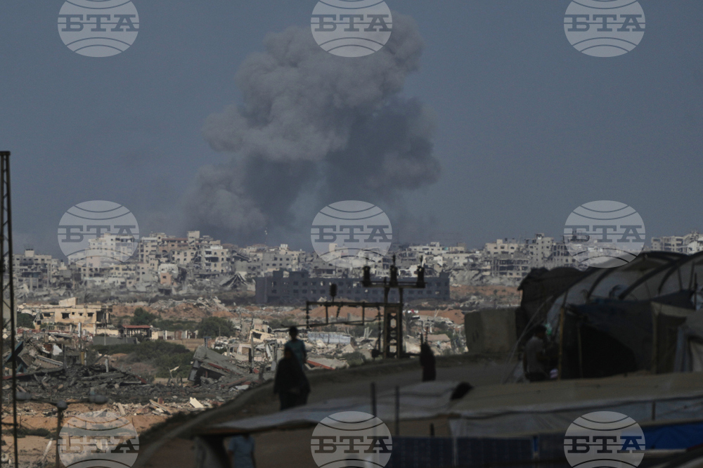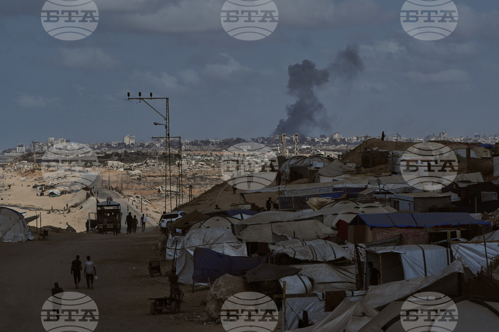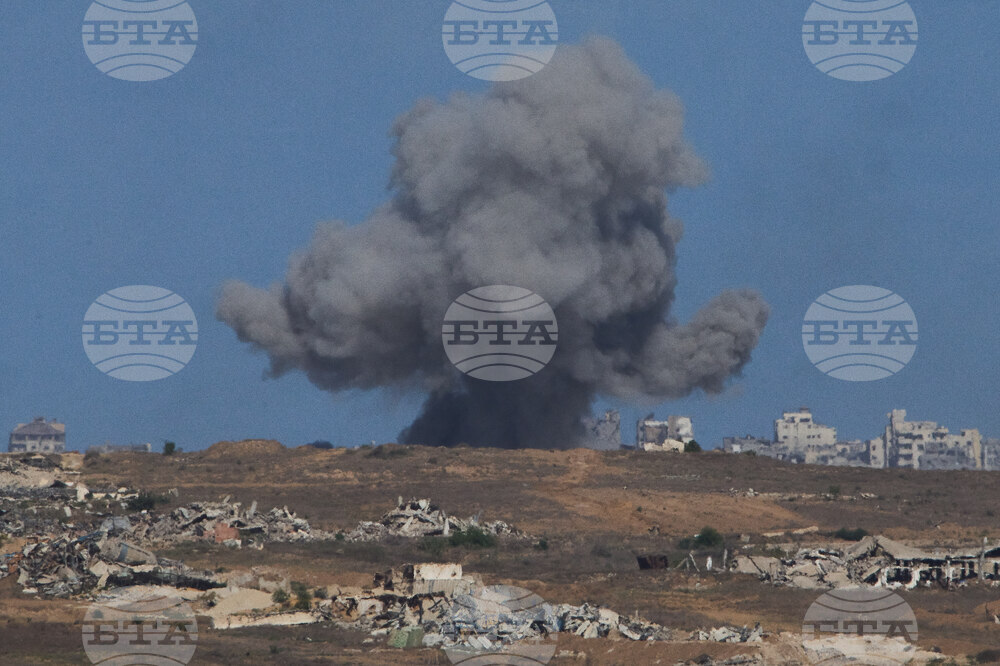 Smoke billows over Gaza Strip following an Israeli bombardment, as seen from southern Israel, Sunday, Oct. 5, 2025. (AP Photo/Ariel Schalit)