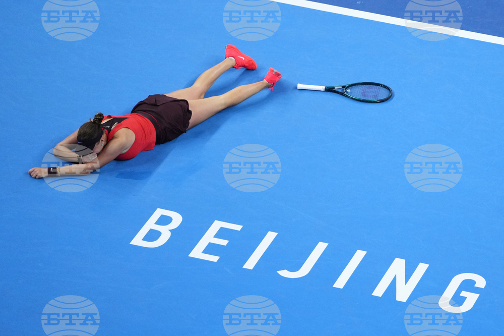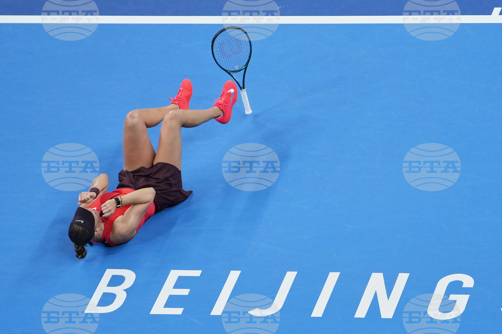 Amanda Anisimova of the United States reacts after defeating Linda Noskova of the Czech Republic in the women's singles final match of the China Open tennis tournament in Beijing, China, Sunday, Oct. 5, 2025.(AP Photo/Ng Han Guan)