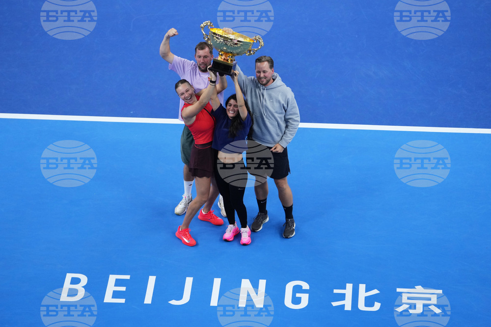 Amanda Anisimova, of the United States celebrates the trophy with her team members after winning the women's singles final match against Linda Noskova, of the Czech Republic, in the China Open tennis tournament, at the National Tennis Center, in Beijing, Sunday, Oct. 5, 2025. (AP Photo/Andy Wong)