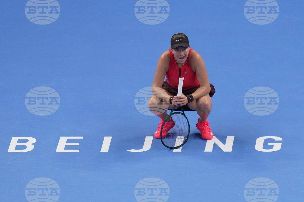 Linda Noskova of the Czech Republic reacts during play against Amanda Anisimova of the United States in the women's singles final match of the China Open tennis tournament in Beijing, China, Sunday, Oct. 5, 2025.(AP Photo/Ng Han Guan)