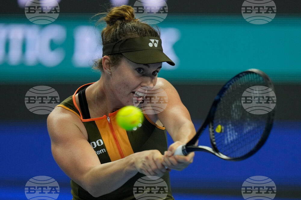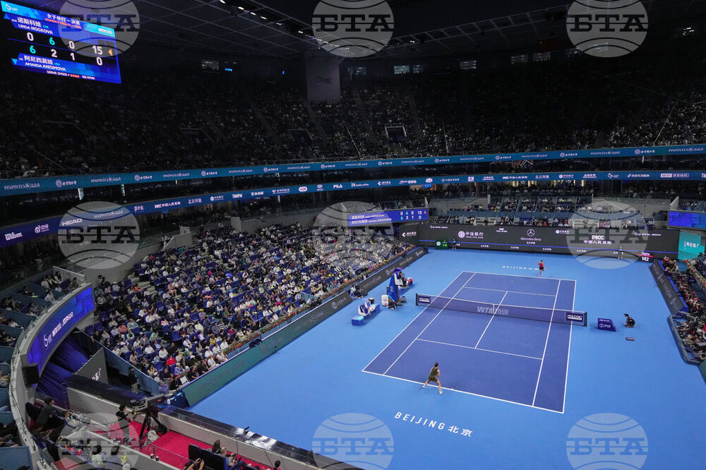 Linda Noskova of the Czech Republic returns the ball from Amanda Anisimova of the United States in the women's singles final match of the China Open tennis tournament in Beijing, China, Sunday, Oct. 5, 2025.(AP Photo/Ng Han Guan)