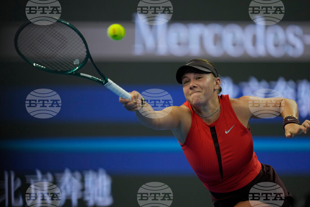 Amanda Anisimova of the United States returns a shot from Linda Noskova of the Czech Republic in the women's singles final match of the China Open tennis tournament in Beijing, China, Sunday, Oct. 5, 2025.(AP Photo/Ng Han Guan)