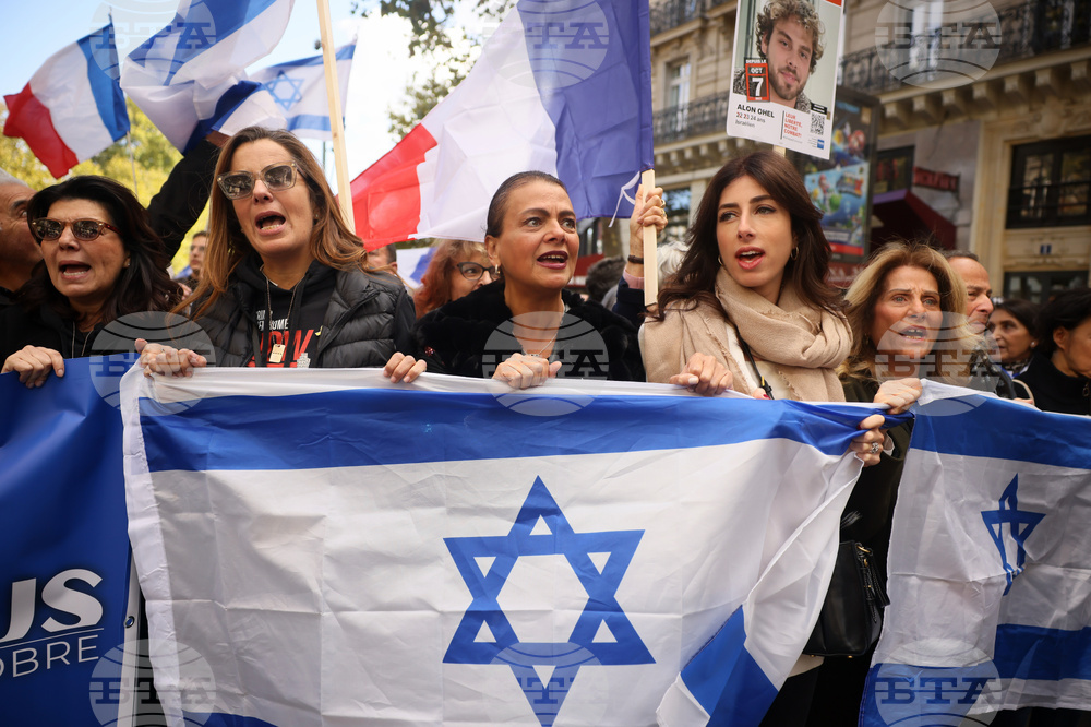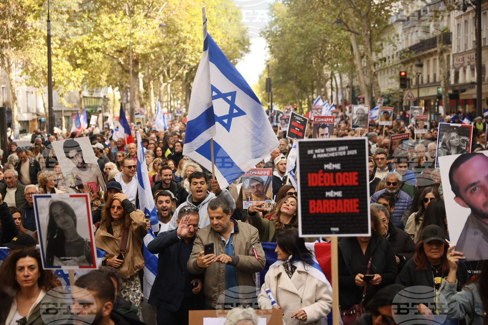 People zqve Israeli flags as they demonstrate in support of Israeli hostages held in the Gaza Strip and demanding their release from Hamas captivity, Sunday, Oct. 5, 2025 in Paris. (AP Photo/Thomas Padilla)