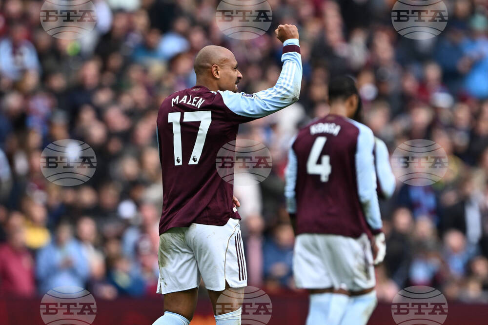 Aston Villa's Donyell Malen, 2nd left, celebrates scoring their side's first goal of the game during the English Premier League soccer match between Aston Villa and Burnley at Villa Park, in Birmingham, England, Sunday Oct. 5, 2025. (Cody Froggatt/PA via AP)